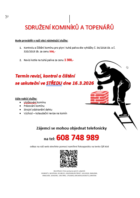 Termín revizí, kontrol a čištění se uskuteční v Trnávce ve STŘEDU dne 16.3.2026