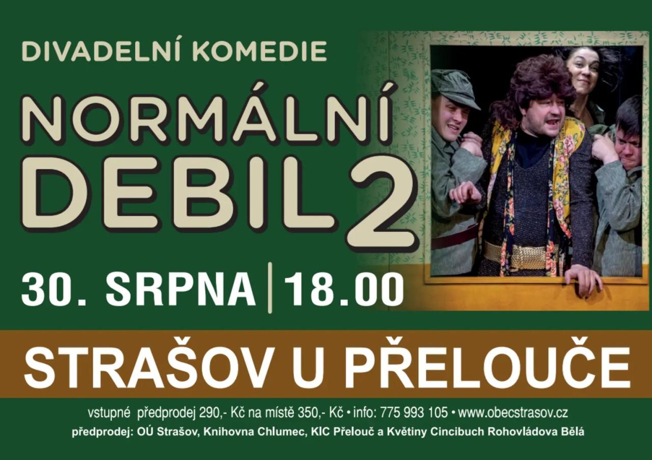 Obec Strašov u Přelouče zve na divadelní představení VD Pardubice ,,Normální debil 2". Představení se koná 30. 8. 2025 od 18hodin v kulturním areálu obce.